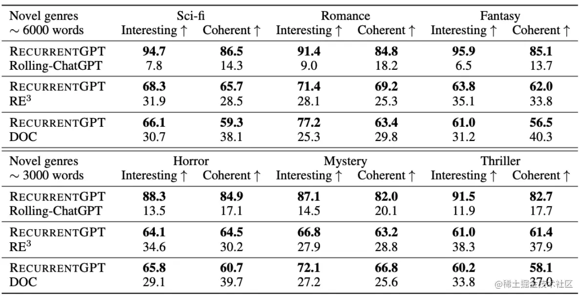 在多种多样的小说风格、类型等方面,人类读者普遍认为 RecurrentGPT 的表现更具趣味性和连贯性。
