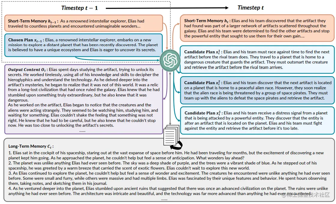 作者们利用这个 Prompt 指示语言模型在更新短期记忆的时候,不仅新增最新生成内容中的有用部分,还要删除掉与之后内容生成无关的过往记忆。除此之外,作者在 Prompting 的过程中,也着重强调了小说写作场景的重现,以使 ChatGPT 生成的内容更具备像小说那样的细节,防止其快速地完成情节的叙述。