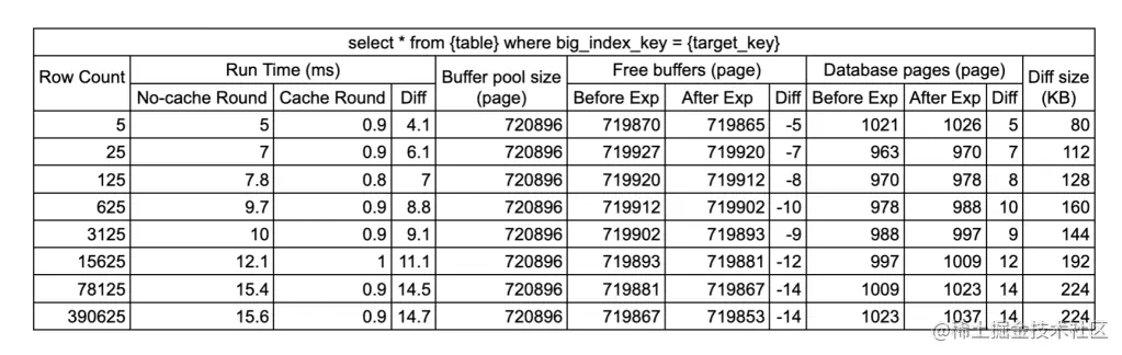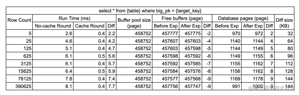 为什么将表格的行数设置为等比数列,并且每个数字在另一个数字后乘以5? 原因是在MySQL 8.0.25中,主键的大小应该小于3072字节,相当于3k。由于每个页面大小为16k,一个页面最多可以容纳5个键。因此,您可以期望在我们的索引B+树中,每个非分支节点最多有5个子节点。拥有5行的表格深度为2,25行的表格深度为3,依此类推...但在实际情况中可能更加复杂,因为页面目录的大小未确定,一些B+树的非分支节点可能只能容纳4个节点,使得树比理论更深。