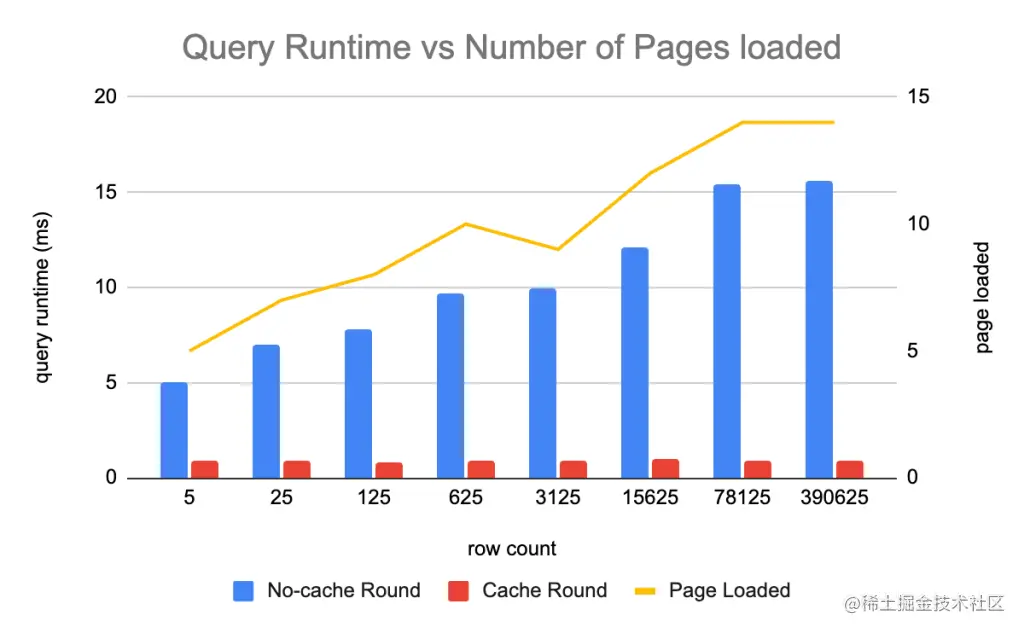 正如我们所见,B+ 树的深度按设计上升了。查询运行时最坏的情况是表有 390,625 行,大约需要 8ms 和 9 倍的 I/O 来查询其主键。