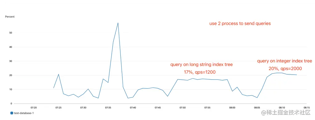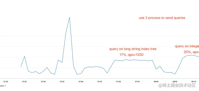 我可以在MySQL上重现这个情况:在运行具有查询语句的两个进程后,当每秒查询率为1200时,CPU使用率已经达到17%。相比之下,对于整数键索引树上的查询语句,每秒查询率为2100时CPU使用率约为20%。