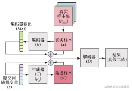 DEGAN(decoder-encoder GAN)模型的提出者认为输入的随机变量服从高斯分布,因此生成器需将整个高斯分布映射到图像,无法反映真实样本分布。因此借鉴 VAE 的思想,在 GAN中加入预训练的编码器与解码器,将随机变量映射为含有真实样本分布信息的变量,再传递给GAN,从而加速收敛并提高生成质量。