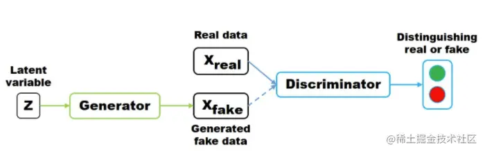 GAN网络主要由生成网络与鉴别网络两个部分,隐变量 (通常为服从高斯分布的随机噪声)通过Generator生成 , 判别器负责判别输入的data是生成的样本 还是真实样本 。