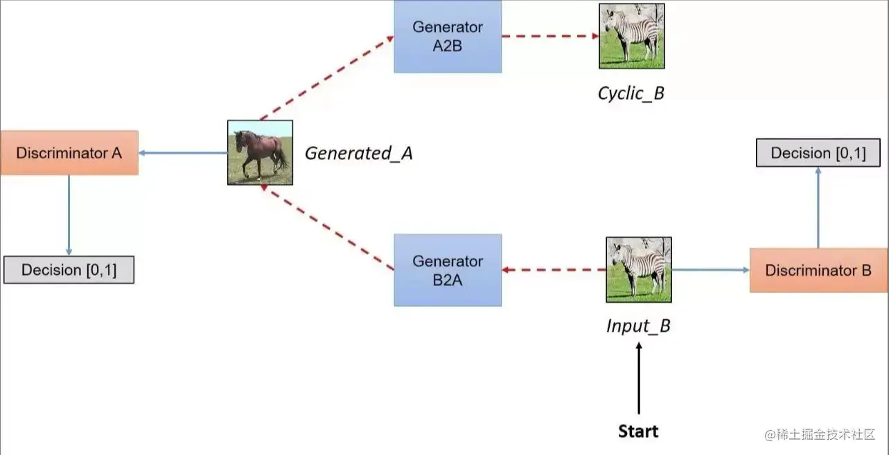 简而言之,该模型通过从域DA获取输入图像,该输入图像被传递到第一个生成器GeneratorA→B,其任务是将来自域DA的给定图像转换到目标域DB中的图像。然后这个新生成的图像被传递到另一个生成器GeneratorB→A,其任务是在原始域DA转换回图像CyclicA,这里可与自动编码器作对比。这个输出图像必须与原始输入图像相似,用来定义非配对数据集中原来不存在的有意义映射。