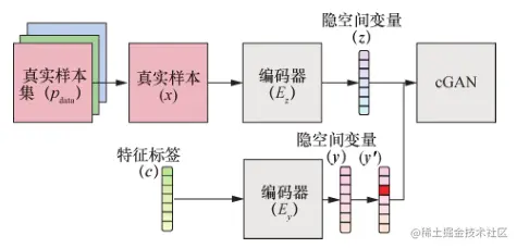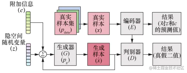 BiCoGAN 模型的提出者认为MIRZA提出的模型的输入 z 与 c 相互纠缠,因此增加了一个编码器(记为 E )用于学习从判别器输出到生成器两个输入的逆映射,从而更精确地编码 c ,以提升模型表现。如图14所示,将 z 与 c 的拼接(记为ˆ z)输入生成器得到输出G(ˆ z) ,将真实样本 x 输入编码器 得 到 输 出 E(x) , 判 别 器 接 收G [(ˆz) ,ˆz] 或[x, E(x)], 作为输入,判定该输入来自生成器或为真实数据的某一类。由于真实样本 x 具有的标签可视为 c ,而 E(x)又可以被拆分为 z'与 c',因此使 c 与 c'尽可能接近,也成为模型训练的目标,从而使编码器学习逆映射。文中提出使用 EFL(extrinsic factor loss)衡量两个分布 p c 与 p c' 的距离,并提出如式(6)所示的目标函数。