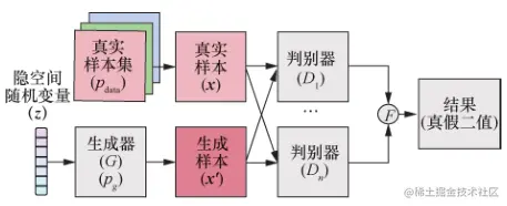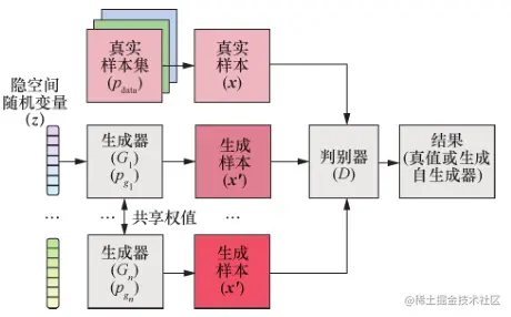 基于生成器进行改进的工作,旨在提高生成样本质量与避免模式崩溃问题,使模型能够生成多种类的样本,且同一种类内的样本具有多样性。改进的思路包括:使用集成学习(ensemble learning)的思想综合多个弱生成器所学习到的模式、设计每个生成器专注于学习特定模式多生成器架构,从而使模型整体包含多个模式,使用多智能体系统的思想使多个生成器之间产生竞争与合作的关系等。