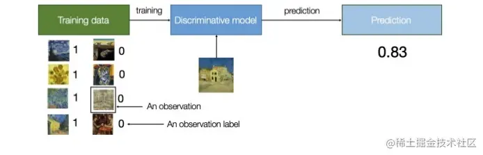 而我们常见的模型,一般属于判别模型。如图2所示,判别模型可以简单的理解为分类。例如把一副图像分成猫或者狗或者其他,像图2中我们训练一个判别模型去辨别是否是梵高的画,这个判别模型会对数据集中的画的特征进行提起和分类,从而区分出哪个是梵高大师所作。
