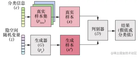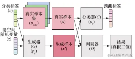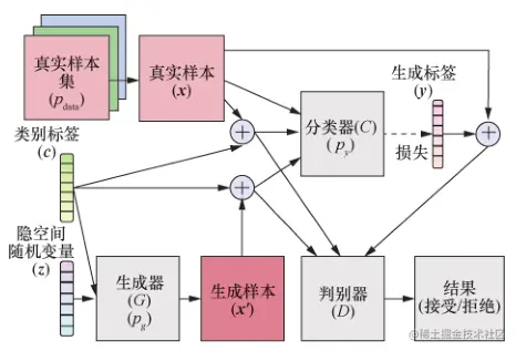 AC-GAN(auxiliary classifier GAN)同时具备MIRZA的模型和ODENA的模型的特点,G 输入随机变量与分类信息 c,D 输出样本为假和分类概率,该方法能够在有条件生成样本时输出生成样本所属的类别。