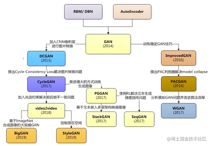 2014年,Ian GoodFellow提出了GAN模型。自GAN提出起,生成对抗网络迅速成为了最火的生成式模型。在快速发展的青春期,GAN产生了许多流行的架构,如DCGAN,StyleGAN,BigGAN,StackGAN,Pix2pix,Age-cGAN,CycleGAN等。这个是生成对抗网络家族图。左边部分主要是改进模型解决实际的图片转换,文本转图像,生成图片,视频转换等实际问题;右边部分则是主要解决GAN框架本身存在的一些问题。传统的生成模型最早要追溯到80年代的RBM,以及后来逐渐使用深度神经网络进行包装的AutoEncoder。然后就是现在称得上最火的生成模型GAN。