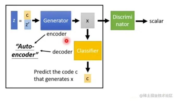 相比起原始的GAN,多了一项 ,这一项代表的就是c与generator的output的互信息。这一项越大,表示c与output越相关。
