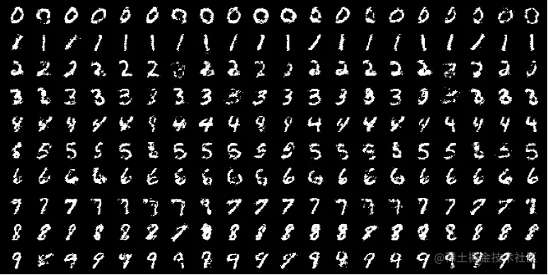 在cGANs的论文中,进行了MNIST数据集的测试。在这个测试中,加入的条件为每个图片的标签。也就是生成器G的输入为随机向量和需要生成的图片的对应标签。判别器D的输入为真实图片和真实图片对应的标签、以及生成图片。下图为生成的一些图片