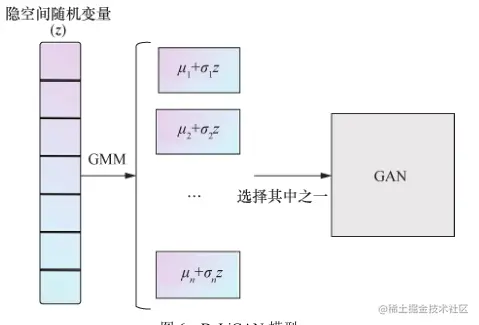 DeLiGAN 适用于训练数据规模小、种类多的场景,DeliGAN 模型如图16所示。Gurumurthy等提出使用 GMM(Gaussian mixture model)对隐空间进行参数化,再随机选择一个高斯分量进行重参数化,从指定的高斯分布中获取样本,但模型使用 GMM 是一种简化假设,限制了其逼近更复杂分布的能力。