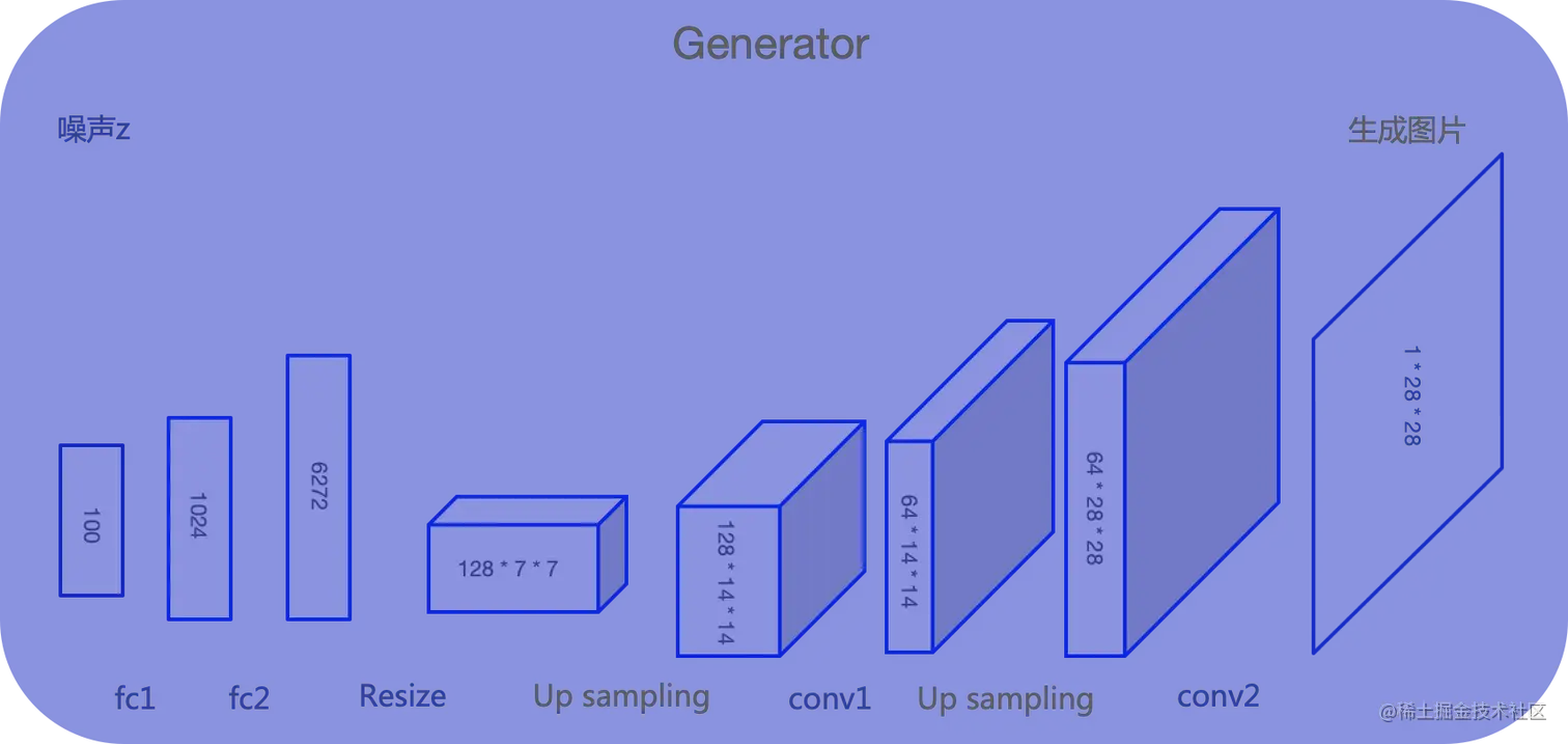 生成器G是一个生成图片的网络,可以采用多层感知机、卷积网络、自编码器等。它接收一个随机的噪声z,通过这个噪声生成图片,记做G(z)。通过下图模型结构讲解生成器如何一步步将噪声生成一张图片: