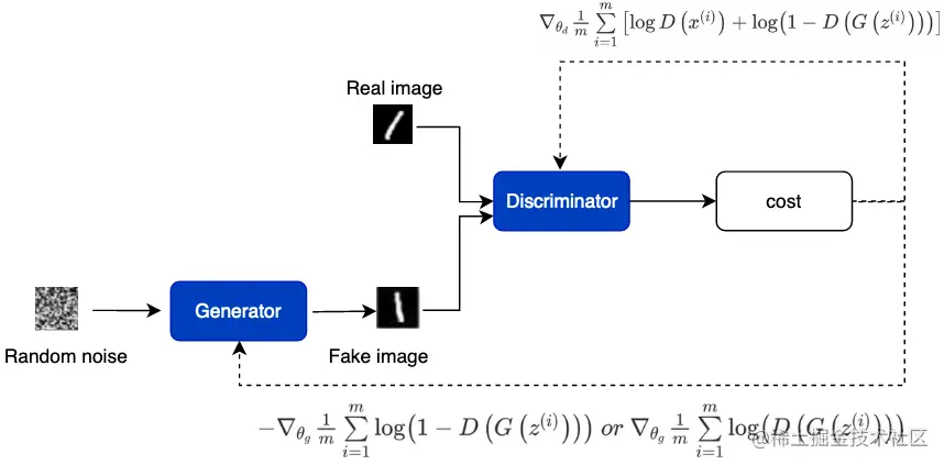 公式左边V(D,G)表示生成图像和真实图像的差异度,采用二分类(真、假两个类别)的交叉熵损失函数。包含minG和maxD两部分: