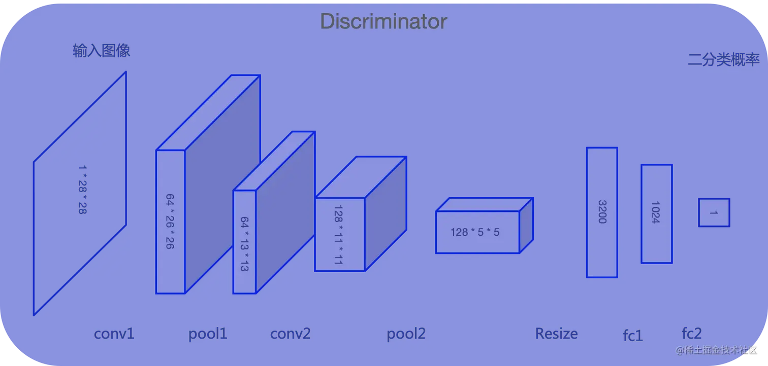 判别器D的输入为真实图像和生成器生成的图像,其目的是将生成的图像从真实图像中尽可能的分辨出来。属于二分类问题,通过下图模型结构讲解判别器如何区分真假图片: