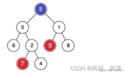 寻找节点7与0的公共祖先为 根节点3 节点7在根的左子树,而节点0在根的右子树