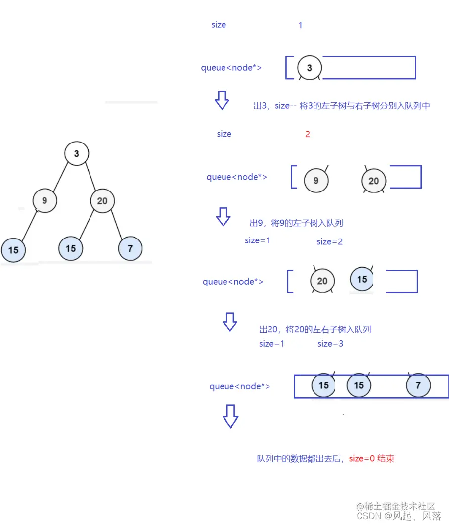 主要思路是借助一个队列,将每一层的数据以size统计,当size为0时说明该层数据已经输入完,将这一层的数据传入vector中,再通过push_back 传入 vector< vector< int >中