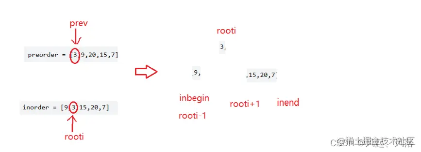 同时每次都需要prev++,来确定新的根, 每次rooti都被赋值为inbegin,是为了中序数组的新区间内寻找到根