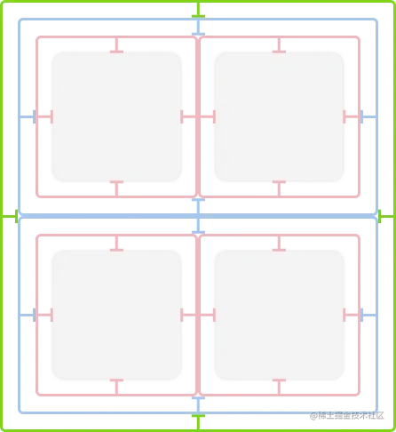contentInsets后的示意图:灰色区域是 Item,红色框是 Item 的边界,蓝色框是 Group 的边界,绿色框是 Section 的边界,绿色的上下左右边距就是设置的 contentInsets。