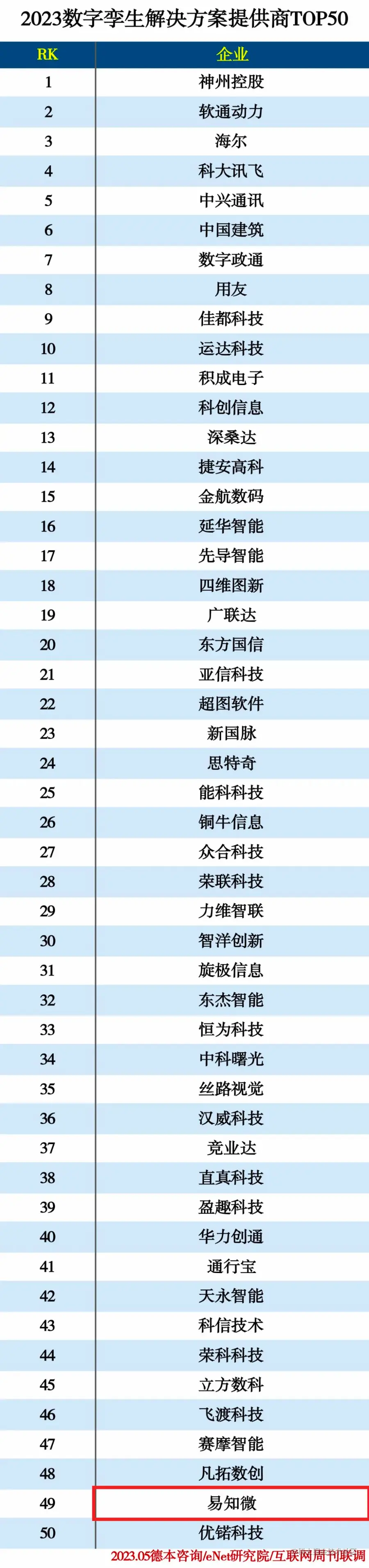 近日,互联网周刊发布《2023数字孪生解决方案提供商TOP50》,杭州易知微科技有限公司在榜。