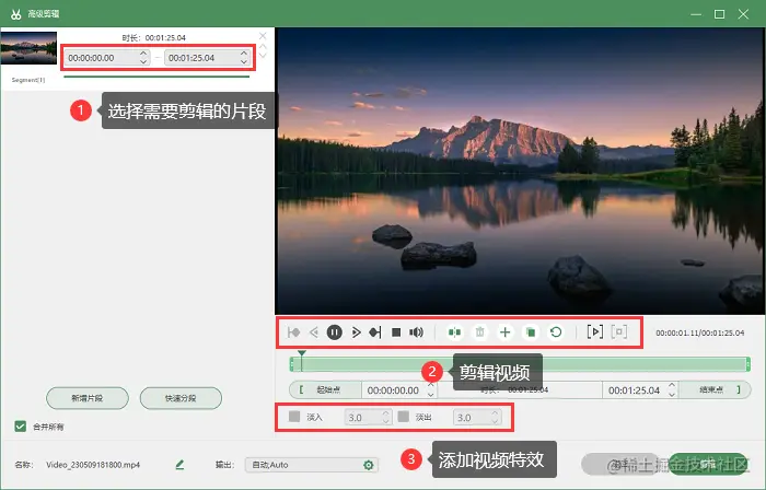 步骤4: 录制完成之后,在【高级剪辑】页面,您可以剪辑视频、给视频添加特效、还可以对视频进行快速分段,接着点击【完成】按钮结束此次录制。