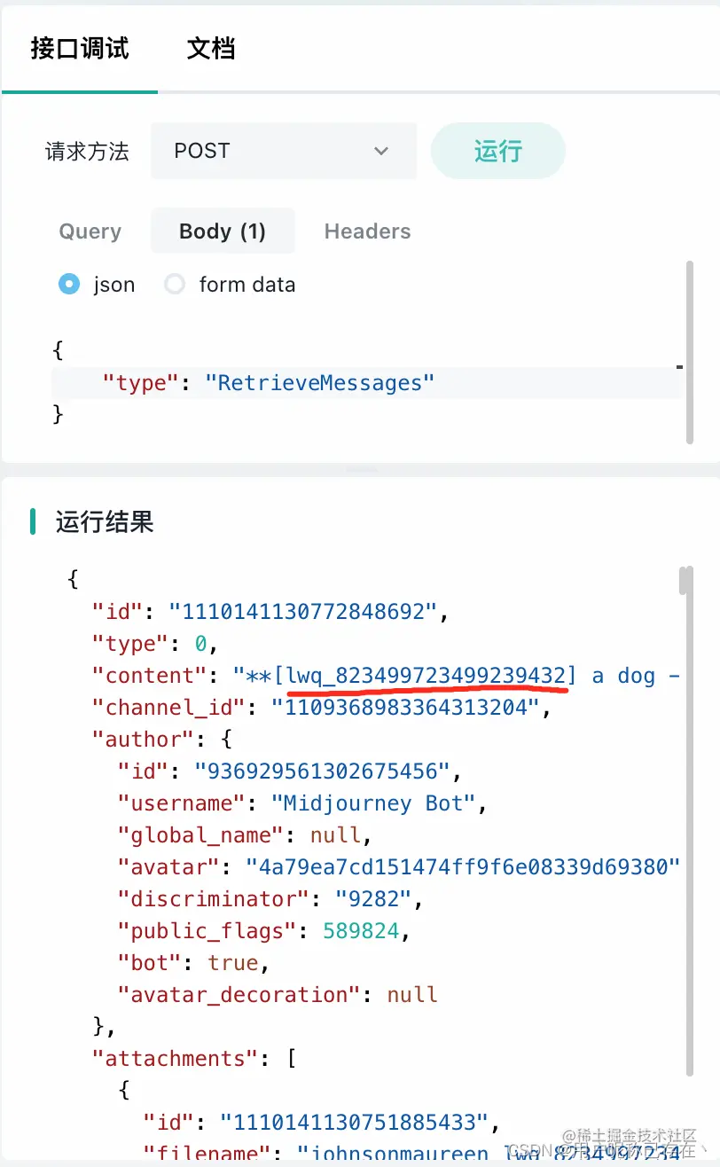 请注意图中红线部分,这就是上面那个msg_Id,通过这个id可以筛选出你自己的结果,对应的attachments内有个url就是你要的图片链接