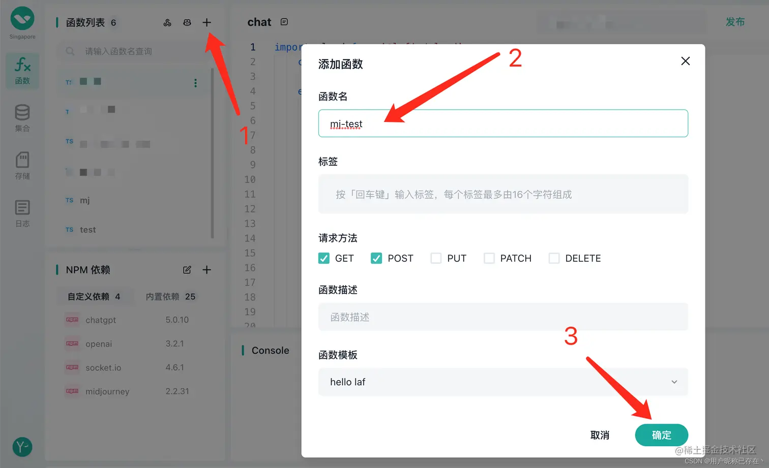 - 编辑云函数代码,复制以下代码全部粘贴进去,这段示例代码由laf提供,有能力的可以自行修改