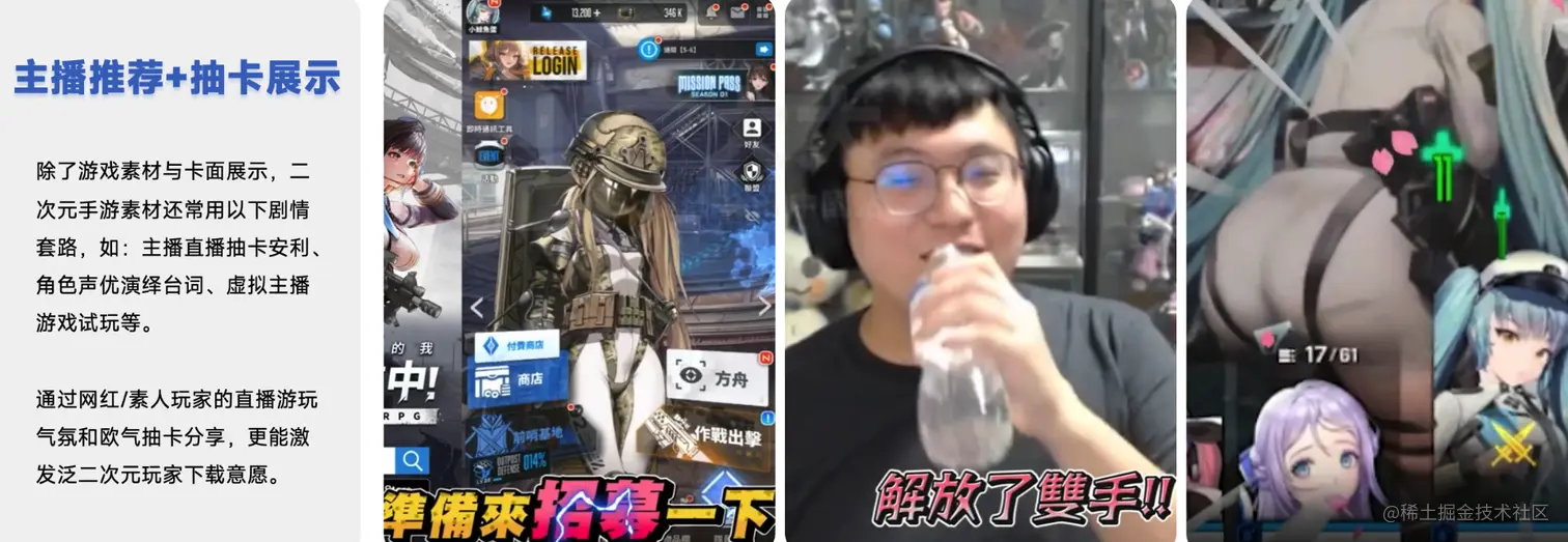 其实,除了常见的动画式美少女买量素材,YouTube式主播安利抽卡和TikTok式6s混剪安利也已成为二次元手游的吸量利器。