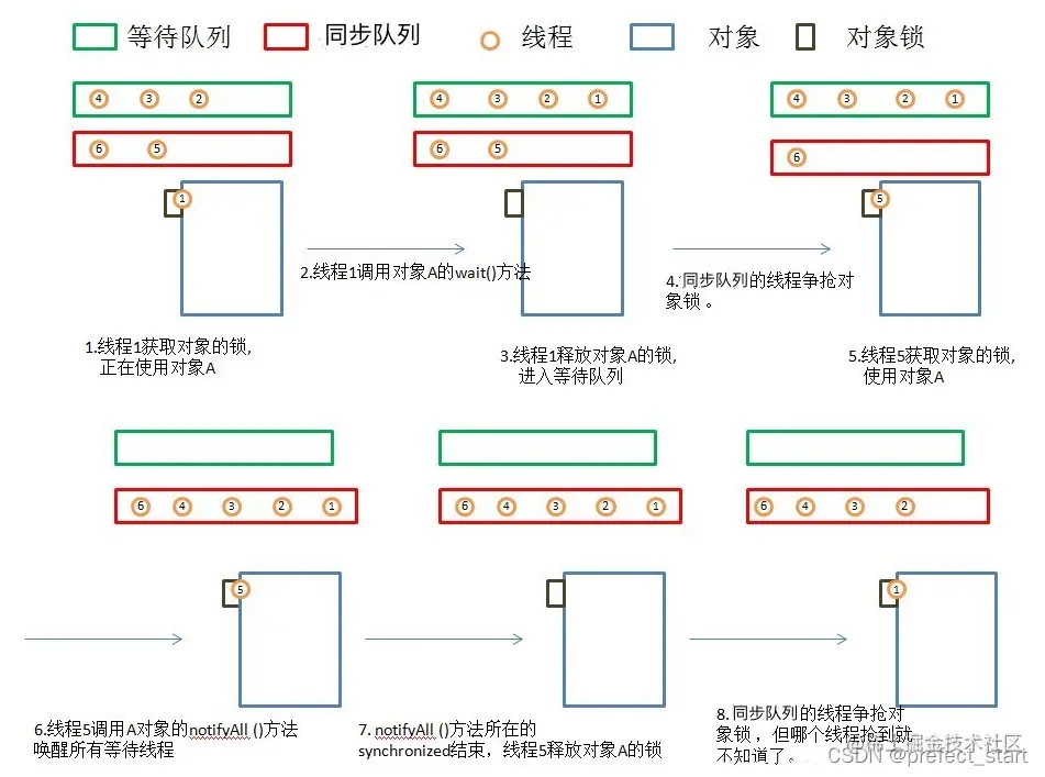 - 线程5调用对象A的notifyAll()方法,唤醒所有线程,所有线程进入同步队列。若线程5调用对象A的notify()方法,则唤醒一个线程,不知道会唤醒谁,被唤醒的那个线程进入同步队列。