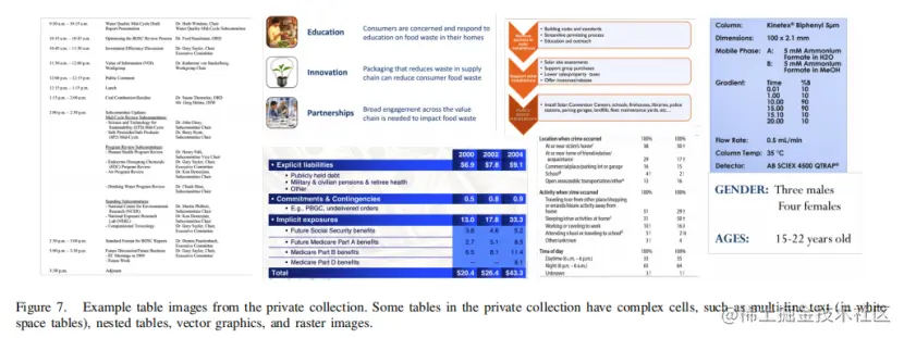 PubTabNet包含500,777个训练图像、9,115个验证图像和9,138张测试图像,它们是通过匹配科学文章的XML和PDF表示而生成的。所有的表格都是以轴向对齐的。由于没有发布测试集的注释,所以作者只报告验证集上的结果。论文提出了一种新的基于树编辑距离的相似度(TEDS)度量,该度量既可以识别表结构识别,也可以识别表结构识别OCR错误。然而,由于不同的TSR方法使用不同的OCR模型不同,考虑OCR误差可能会导致不公平的比较。最近的一些工作提出了一种改进的TEDS度量TEDS-Struct,仅通过忽略OCR误差来评估表结构识别精度。作者还使用这个修改后的度量值来评估作者在这个数据集上的方法。