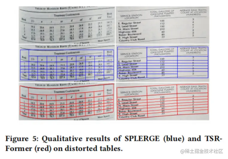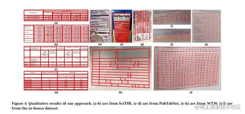 图5和图4中的定性结果表明,论文的方法对于具有复杂结构、无边界单元格、大空白空间、空白或跨行单元格以及扭曲甚至弯曲形状的表格具有鲁棒性。