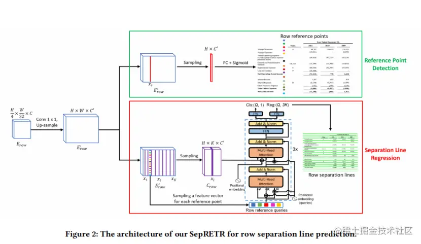 基于SepRETR的分离线预测:如图3所示,作者使用三条平行的曲线线分别表示每行分隔符的顶边界、中心线和底边界。每条曲线用K= 15个点表示,其x坐标分别设置为x_1,x_2,……x_k.对于每一行分隔符,其3K点的y坐标由作者的SepRETR模型直接预测。在这里,作者为第i个x的x坐标设置了X_i=\frac W{16}×{i}。对于列分支中的y坐标,作者只需要用H替换W。如图2所示,作者的SepRETR包含两个模块:一个参考点检测模块和一个用于分割线回归的DETR解码器。