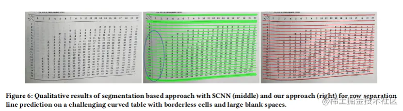 基于SepRETR的分割模块的有效性:为了验证基于回归的分离预测模块的有效性,作者采用RobusTabNet,去掉基于分割线回归模块SepRETR,直接使用辅助分离分割分支进行分离线预测,实现了另一个基于分割的分割模块。启发式mask-to-line模块也与RobusTabNet中的相同。表5中的结果表明,论文的分离回归模块明显优于基于分割的分割模块。图6显示了一些定性的结果。后处理模块很难很好地处理这种低质量的mask。相比之下,基于回归的方法是启发式的,对这些具有挑战性的表鲁棒。