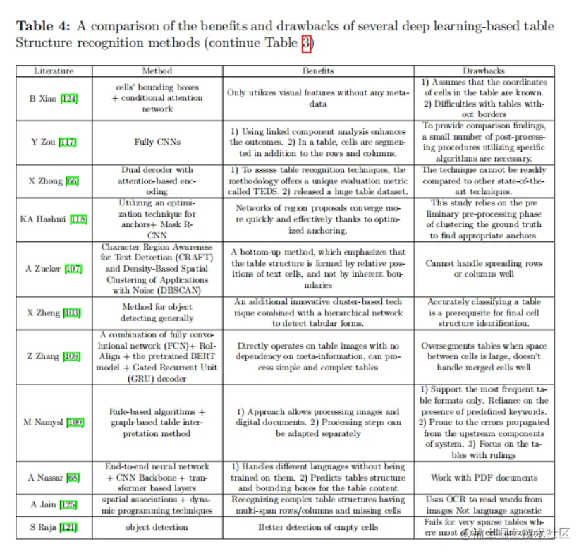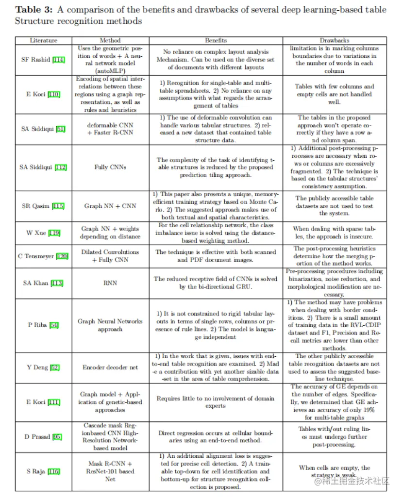 SA Khan提出了一个鲁棒的基于深度学习的解决方案,用于从文档图片中已识别的表格中提取行和列。表格图片经过预处理,然后使用门控递归单元(GRU)和具有softmax激活的全连接层发送到双向递归神经网络。SF Rashid提供了一种新的基于学习的方法来识别不同文档图片中的表格内容。SR Qasim提出了一种基于图网络的表识别架构,作为典型神经网络的替代方案。S Raja提出了一种识别表格结构的方法,该方法结合了单元格检测和交互模块来定位单元格,并根据行和列预测它们与其他检测到的单元格的关系。此外,增加了结构限制的损失功能的单元格识别作为额外的差异组件。Y Deng 测试了现有的端到端表识别的问题,他还强调了在这一领域需要一个更大的数据集。
