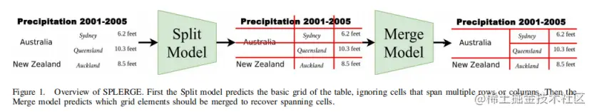 论文提出的表格结构提取方法是SPLERGE,它由两个深度学习模型组成,它们按顺序执行分割和合并操作(见图1)。分割模型接受一个裁剪良好的表格的输入图像,并以跨越整个图像的行和列分隔符的形式生成表格的网格结构。由于某些表包含生成单元格,因此作者将合并模型应用于拆分模型的网格输出,以将相邻的网格元素合并在一起,以恢复生成单元格。