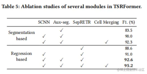 SepRETR设计的消融研究:论文还进行了以下消融研究,以进一步研究SepRETR中三个关键成分的贡献,即transformer解码器,用于cross-attention和集合预测的特征。对于没有集预测的实验,实验设计了一个启发式的标签分配规则。如果一个参考点位于分隔符的两个边界之间,则其对应的查询将被视为一个正样本,而回归目标是它所在的分隔符。否则,对此参考点的查询是一个负样本。由于这种策略可以为一个分割行分配多个查询,为了删除重复的结果,实验将NMS应用于从每个预测行的两个边界生成的多边形。如表6所示,使用transformer解码器来帮助每个查询同时利用全局上下文和本地信息,可以显著提高基于SepRETR的分割模块的性能。此外,表6的最后两行显示,使用采样的高分辨率特征图C_{row}和C_{col}可以进一步提高f1-score 0.5%。虽然没有集预测的结果是好的,但作者发现这种方法对一些启发式设计非常敏感,如标签分配规则和NMS。相反,用集预测损失训练SepRETR不仅可以获得更好的结果,而且可以摆脱这种启发式设计的局限性。