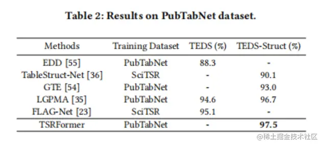 在PubTabNet上,如表2所示,论文的方法在TEDS-Struct评分上达到了97.5%,比LGPMA(ICDAR 2021科学文献解析任务B竞赛中的获胜者)高0.8%。