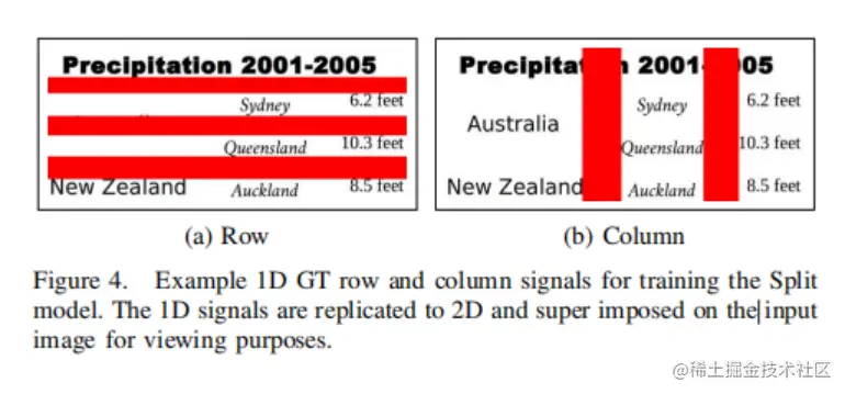 每个表都有注释的GT一维信号r^和c^。GT的设计是为了最大化分隔区域的大小,而不相交于任何非跨行单元的内容,如图4所示。这与传统的单元格分隔符的概念相反,对于许多表来说,单元格分隔器是只有几个像素厚的细线。预测小区域比预测大区域更困难,而且在无线表格的情况下,单元格分隔符的确切位置定义不明确。GT分隔符区域可能与跨越多行或列的单元格内容相交。分割模型的目标是恢复表格的基本网格,并且生成单元格由合并模型来处理。