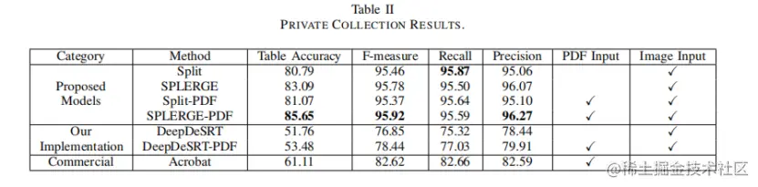 作者提出的模型的所有变体在所有指标上都显著优于两个baseline。作者还看到,因为使用分割模型不能单独处理具有跨行单元格的表,合并模型显著提高了表格的准确性。对于需要合并的表,每个表需要合并的平均数量比ICDAR 2013要少得多,从而导致更少的L形预测。作者还观察到,使用PDF信息作为输入确实带来了改善,但比ICDAR 2013的数据更轻微。这可能反映了这样一个事实,即ICDAR 2013和私有集合之间的域差异在渲染的PDF中更为明显,但当只检查文本或路径图像通道时,差异就减少了。这表明这种方法可能是有效的。