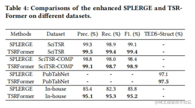 为了验证TSRFrormer对更具有挑战性的无边界表的有效性,作者重新实现了另一种基于分割和合并的方法SPLERGE,并在几个数据集上与论文的方法进行了比较。为了公平比较,作者利用TSRFromer相同的模型架构,只实现了另一个分割线预测模块,该模块首先通过行/列级池增强特征映射,然后通过对水平/垂直切片中的像素进行分类来预测轴对齐的分隔符。如表4所示,重新实现的SPLERGE可以在SciTSR和PubTabNet数据集上取得竞争性的结果,而在具有挑战性的内部数据集上,它仍然比TSRFromer低11.4%。