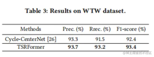 为了验证论文的方法在自然场景中边界扭曲/弯曲表格对象的有效性,作者在WTW数据集上进行了实验,表3的结果表明,论文的方法在f1-score上比cycle-centernet(专门为此场景设计)好1.0%
