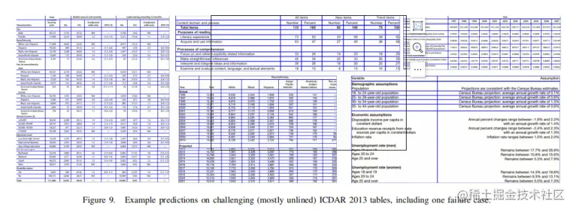 在这个数据集上,作者使用精度和对正确检测到的细胞的召回率来评估方法。作者还报告了具有完美精确度和召回率的表的百分率。如果一个预测的边界框(BB)完全只包含一个GT单元格内容BB,那么它将是一个正确的预测。特别是,与多个GT BB相交或不完全包含任何GT BB的预测BB被标记为false positive。不匹配的GT BB被标记为false negative。因为空白单元格没有被手动注释,所以作者排除了不与任何GT BB相交的预测BB。这样,如果方法正确地预测了未标记的空白单元格,那么它们就不会受到惩罚。