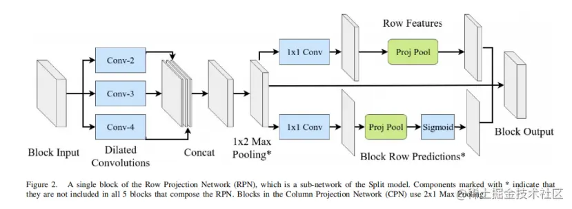 SFCN的输出被作为RPN和CPN的输入。RPN的输出为r,即每一行像素是行分隔符区域的一部分的概率。同样,CPN的输出为c。因为RPN和CPN具有相同的结构,除了投影和池化操作是在像素的行还是列上,所以只集中讨论RPN。