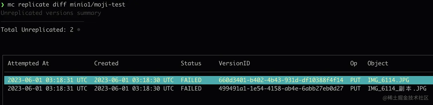 暂时关闭 minio2,在 minio1 上传文件,复制失败,可通过 diff 查看未成功复制的数据列表:(重启 minio2 即可自动重新复制成功)
