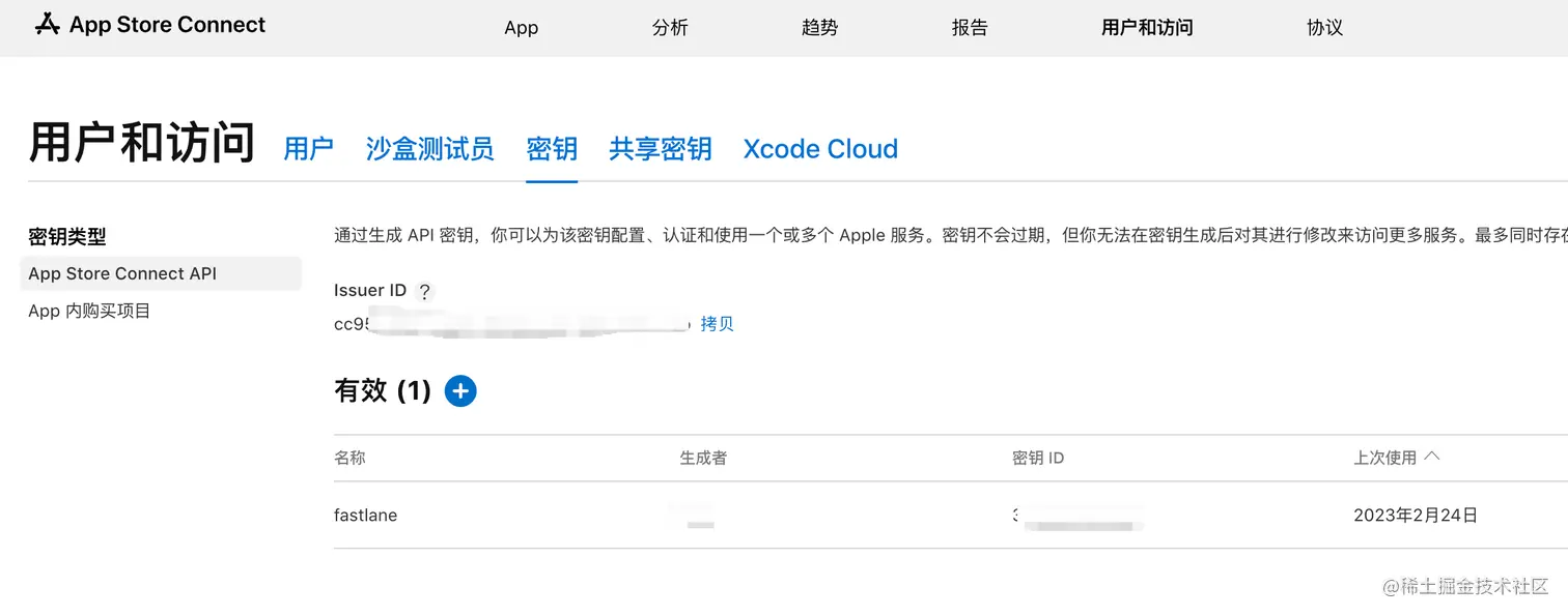 从苹果开发者后台创建添加 App Store Connect API 密钥