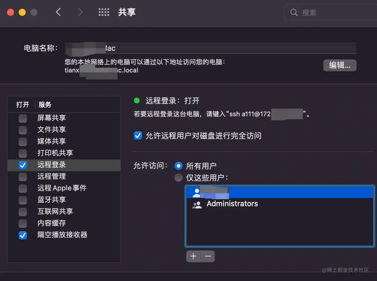 同时,需要在该mac机器上开启ssh权限,在mac系统设置 - 共享 开启相关权限