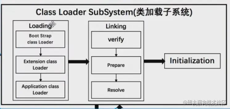 而我们的发生的类加载是在 类装载器 里发生的,里面的一共分为三部: