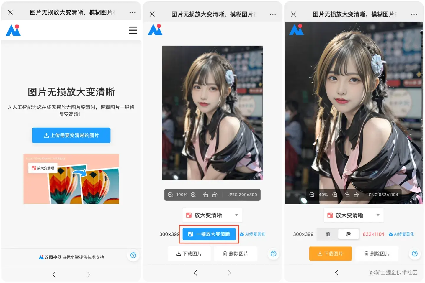 在首页找到【无损放大变清晰】,点击上传你需要修复的图片到网站中,直接点击【一键放大变清晰】,几乎无需等待就能得到一张修复变高清的图像了,选择下载图片保存到手机里即可~