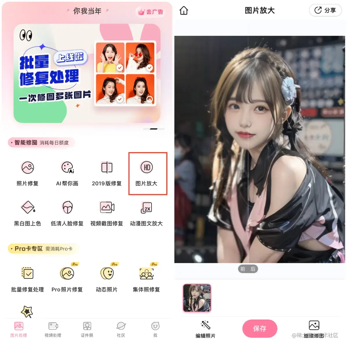 最后给大家推荐一个宝藏APP你我当年,是一个专门进行图片修复的图像处理APP,如果需要把图片变清晰就可以选择【图片放大】版块,上传图片到app里就能一键修复了。