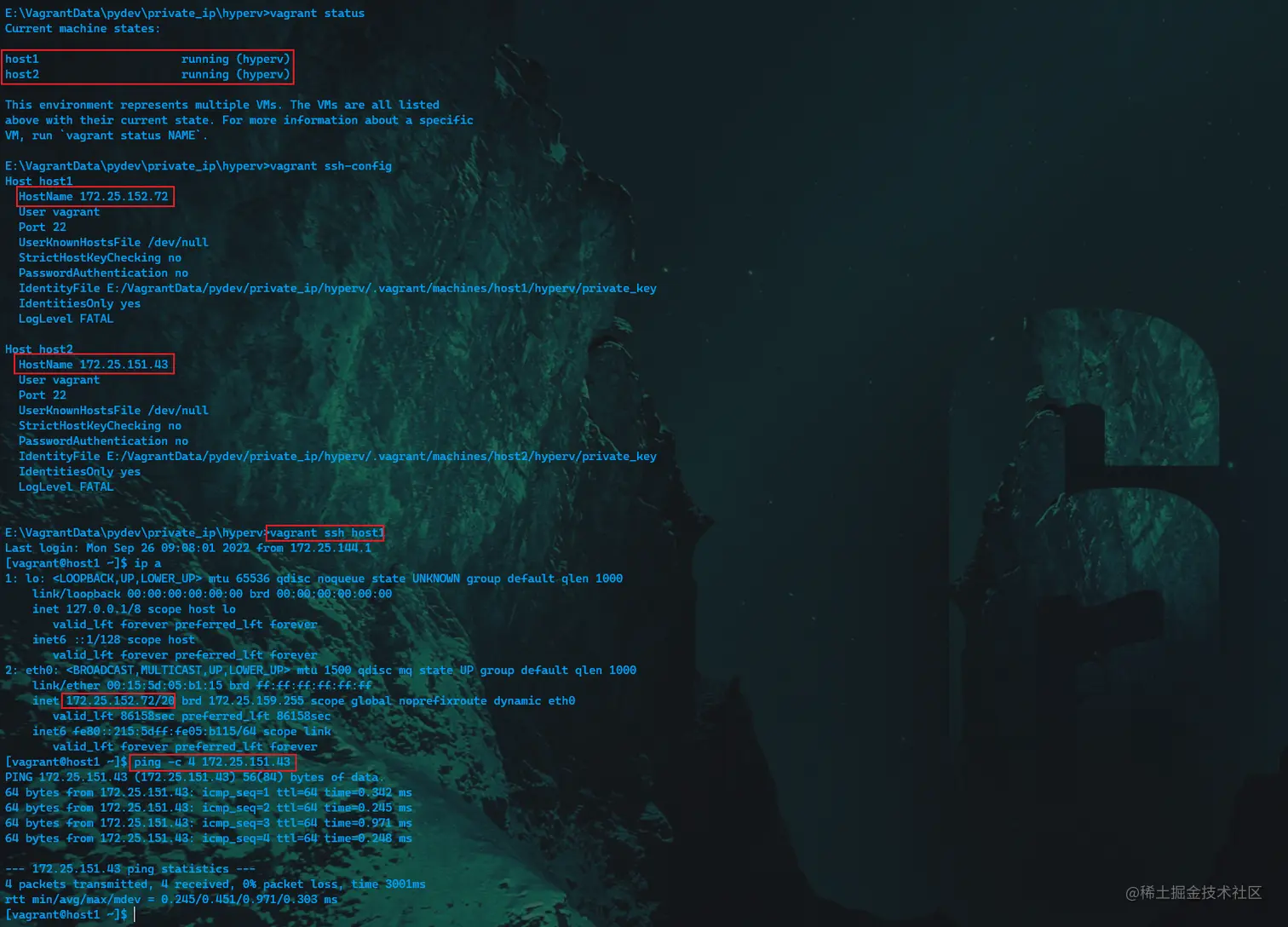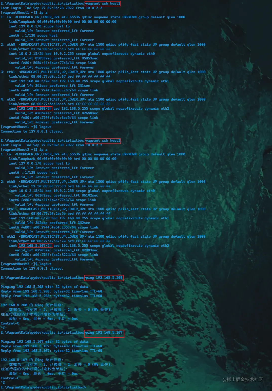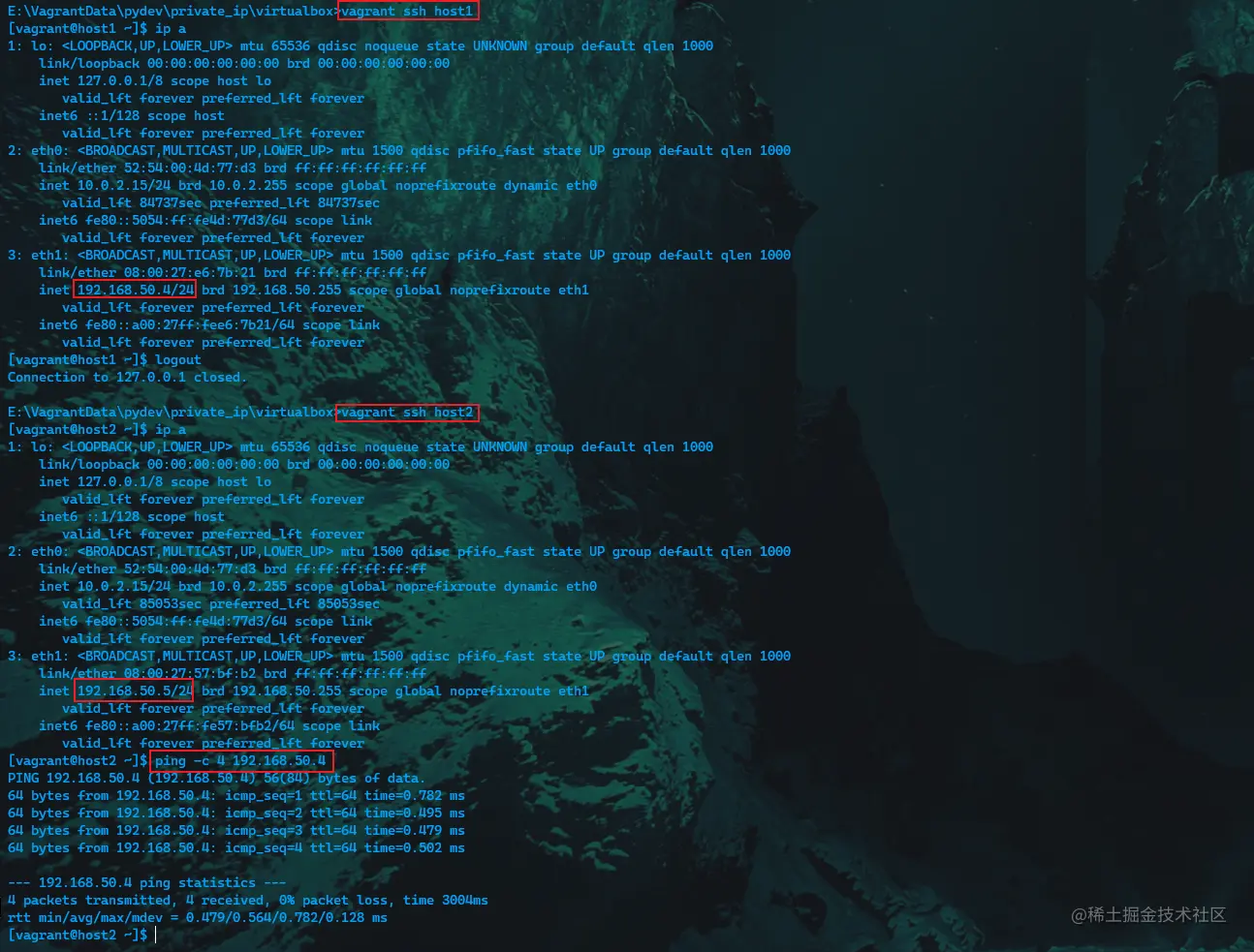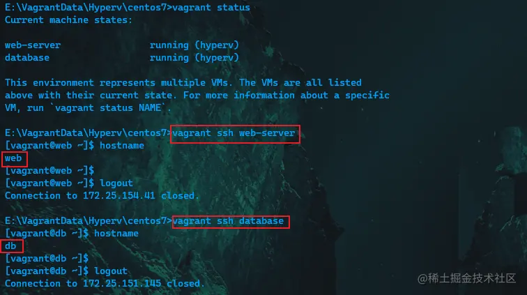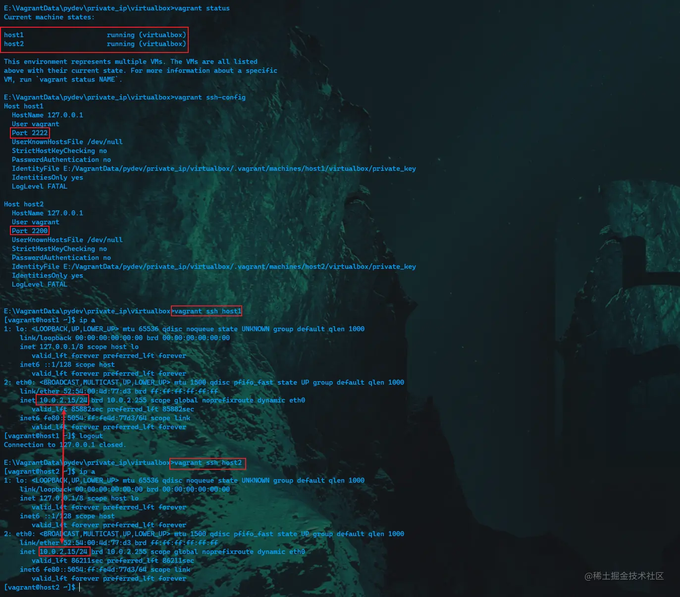 vagrant ssh <name>- 通过VirtualBox建立的虚拟机,是通过和本机127.0.0.1上任意端口进行端口映射实现登陆的